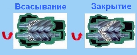 Воздух поступает в рабочие камеры через входное отверстие и сжимается при движении роторов. Затем сжатый воздух покидает рабочие камеры через выходное отверстие.