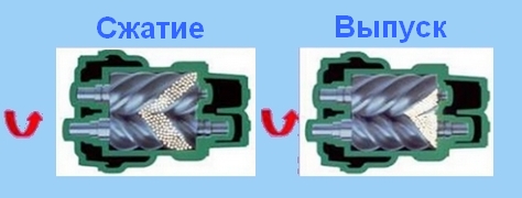 В винтовой компрессорной установке за сжатие отвечает винтовой блок, в котором находятся как правило два винта (ротора). Компрессия происходит за счет движения этих винтов и изменения полости сжатия — таков основной принцип работы винтового компрессора.