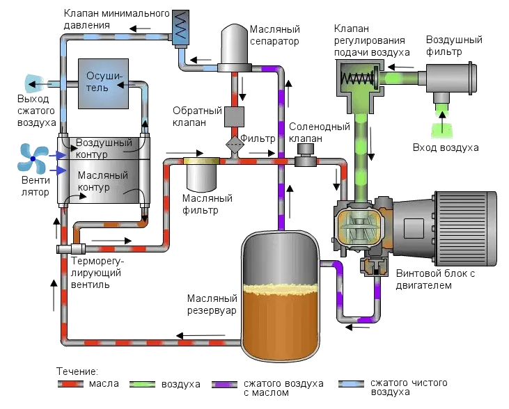 Сразу после запуска компрессора масло в нем циркулирует по малому кругу, что обеспечивает довольно быстрый рост температуры. Это необходимо, чтобы при сжатии воздуха не происходило выпадение конденсата и смешивание его с маслом, значительно ухудшающее его эксплуатационные свойства.