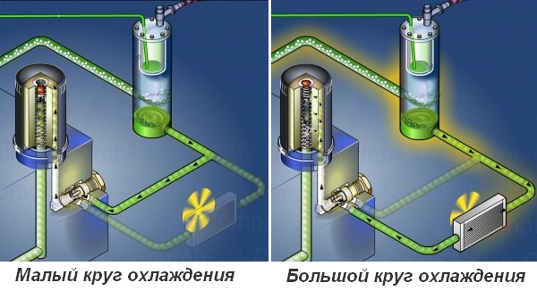 После достижения определенного значения температуры масла термостат открывается, направляя поток циркуляции по большому кругу – через охлаждаемый вентилятором радиатор.