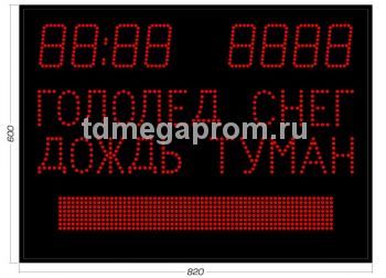 Электронные табло-метеостанции от ТД "МЕГАПРОМ" производятся в России и проходят трехэтапную проверку в процессе изготовления: входящий контроль качества элементной базы, промежуточный контроль работоспособности табло, финишная проверка в течение 48 часов (электропрогон). Высокая яркость светодиодов в сегменте уличных электронных табло обеспечивает легкость восприятия и считываемость информации. Уличную метеостанцию можно купить с доставкой по России. Цена метеотабло зависит от цвета свечения табло и количества дополнительных опций.