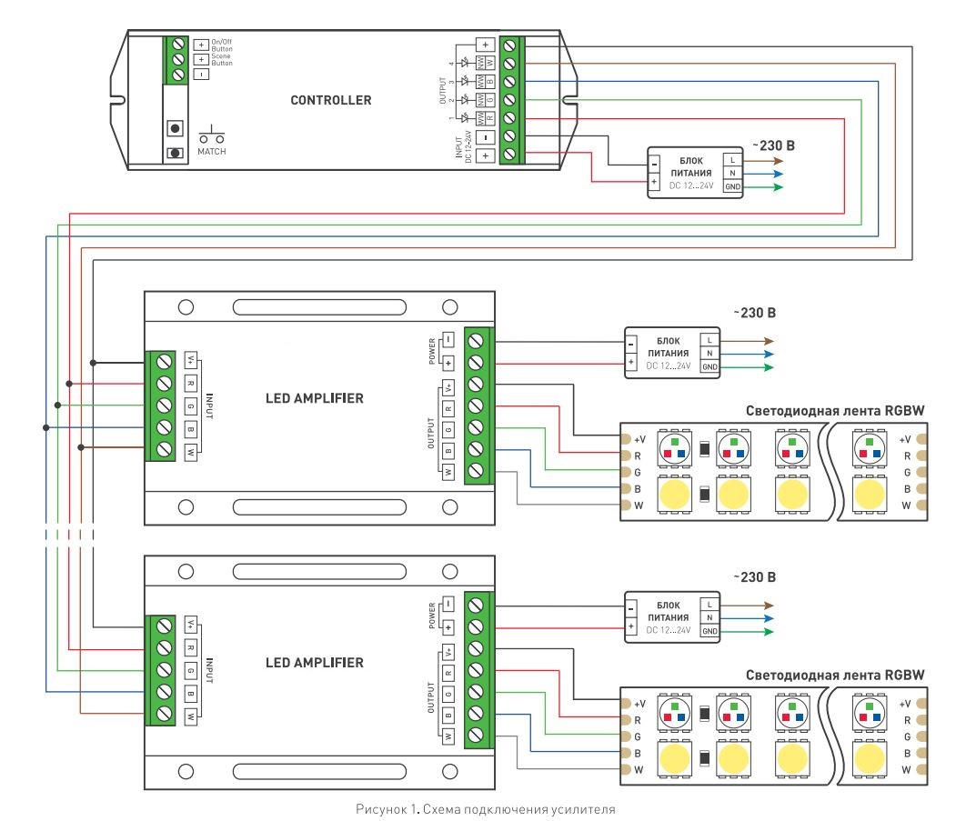 Использование усилителей позволяет практически неограниченно наращивать количество светодиодной ленты, модулей или светильников в системе.